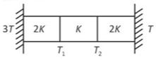 Three identical heat conducting rods are connected in series as shown in the figure. The rods on the sides have thermal conductivity 2K while that in the middle has thermal conductivity K. The left end of the combination is maintained at temperature 3T and the right end at T. The rods are thermally insulated from outside. In steady state, temperature at the left junction is \(\text{T}_1\), and that at the right junction is \(\text{T}_2\). The ratio \(\text{T}_1\,\\,\text{T}_2\) is