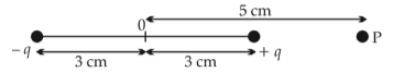 The electric potential in \(10^2\,V\) at point P due to dipole is (\(E_0 =\).permittivity of free space and \(\displaystyle \frac{1}{4πϵ_0}=k\) )